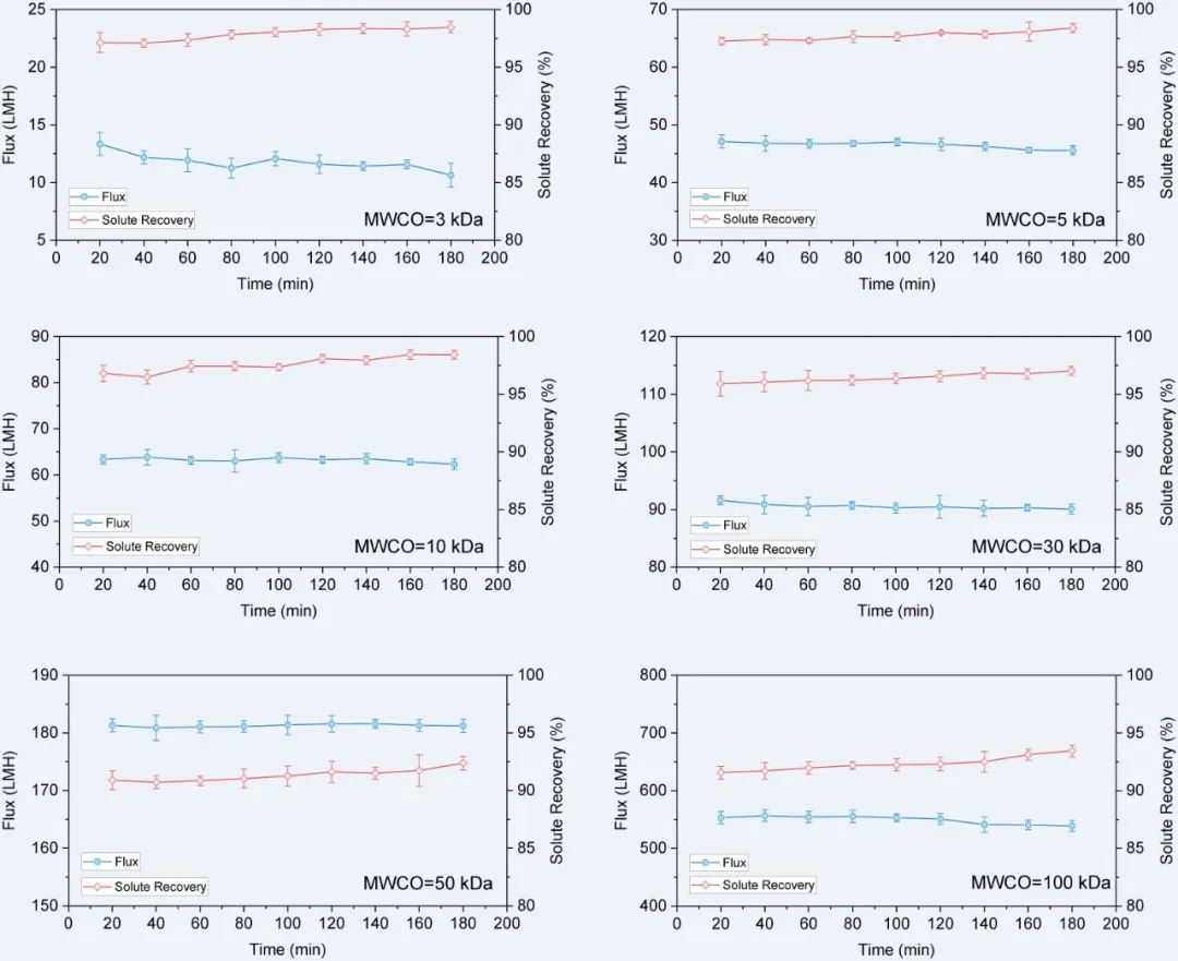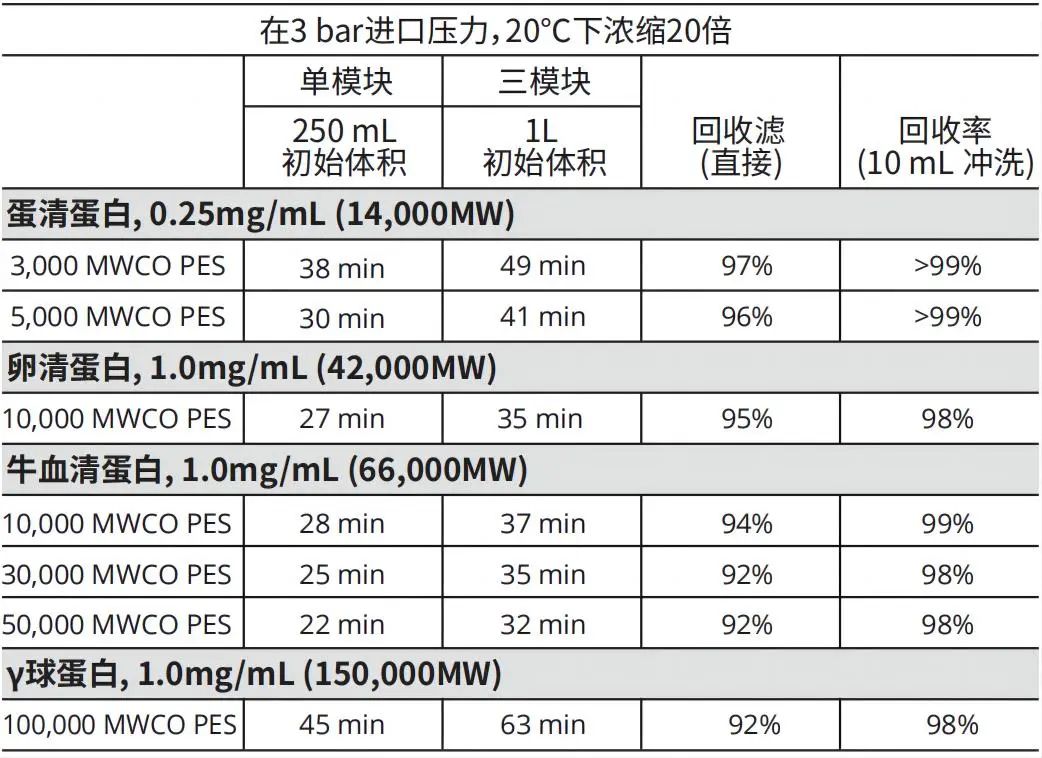 下面是我們配置了四種不同濃度的蛋白溶液包括蛋清蛋白, 0.25mg/mL (14,000MW)、卵清蛋白, 1.0mg/mL (42,000MW)、牛血清蛋白, 1.0mg/mL (66,000MW)、γ球蛋白, 1.0mg/mL (150,000MW)等,用我們不同分子截留的單模塊和三模塊的PRISM 50超濾膜包進行截留,實驗條件在3 bar進口壓力,20℃下濃縮20倍,其平均直接回收率在94%以上,在10mL沖洗的條件下平均回收率達到98%以上,其過程對純水的通量總體恢復非常穩(wěn)定,沒有明顯的下降趨勢。