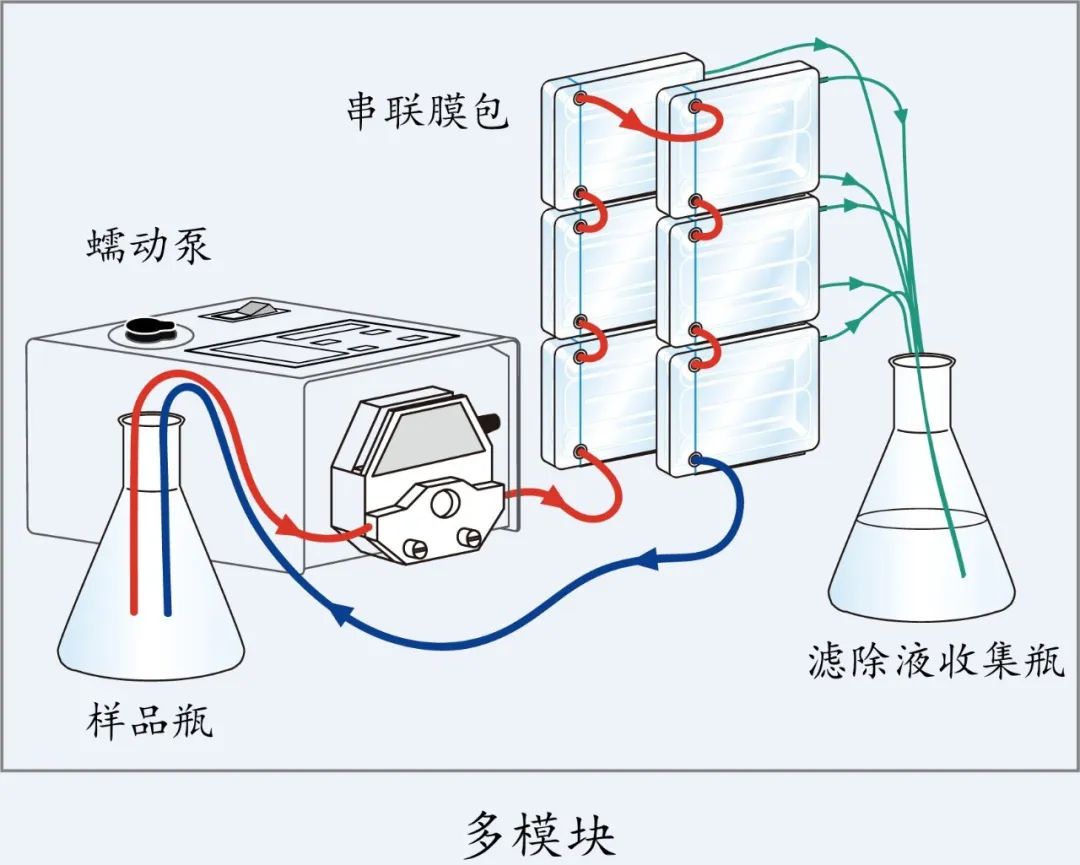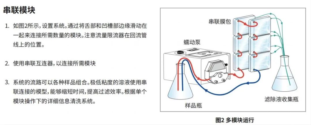 PRISM 50的模塊化設計使多個模塊串聯(lián)操作。這將最大吞吐量提高到3升,并與膜面積成比例地加快處理速度(見下圖)。