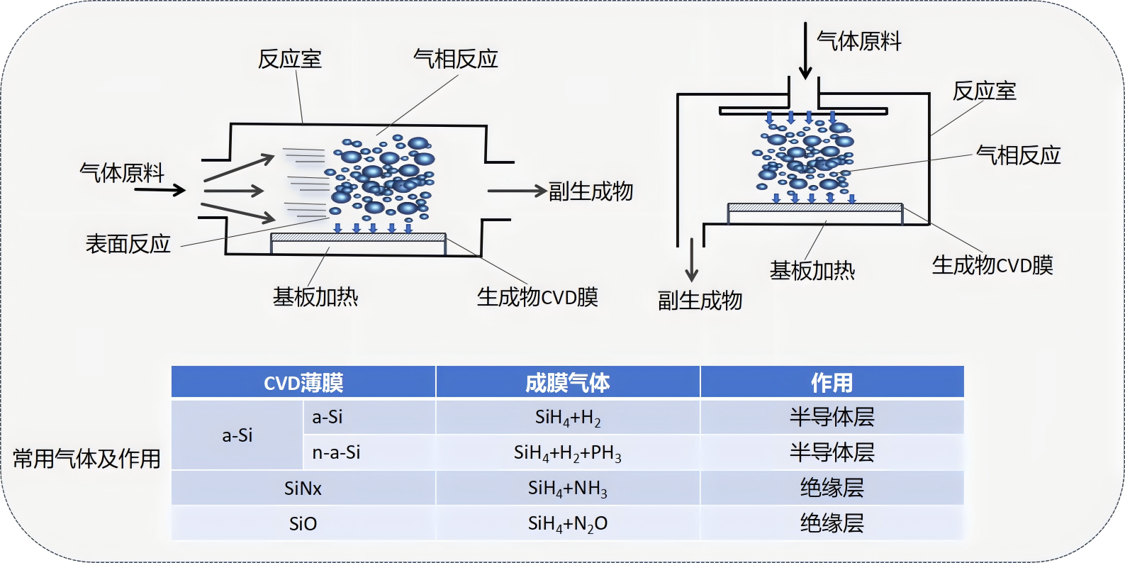2)化學(xué)氣相沉積(Chemical Vapor Deposition,CVD)是通過(guò)化學(xué)反應(yīng),將氣相前驅(qū)物轉(zhuǎn)化為固態(tài)薄膜,沉積在基片表面。
