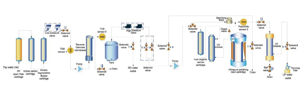 超純水 (UPW) 通常被認(rèn)為是在 25ºC 時(shí)電阻率大于18MΩ.cm或接近18.3MΩ.cm水,水中的導(dǎo)電介質(zhì)幾乎完全去除,又把水中不離解的膠體物質(zhì)、氣體及有機(jī)物均去除至很低程度的水?,F(xiàn)在的超純水制備采用了預(yù)處理、電滲析(EDI)紫外線殺菌、反滲透(RO)、離子交換及各種膜過濾技術(shù)等。